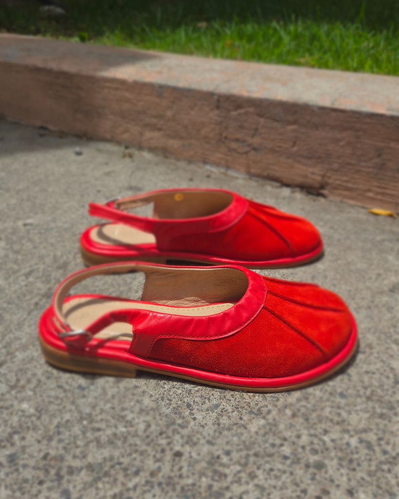 Zapato bajo destalonado. Fabricado en combinación de cuero reno y napa rojo  y punta redonda. Regula el calce con la hebilla en color plata. Planta completa con acolchado medio para más comodidad.