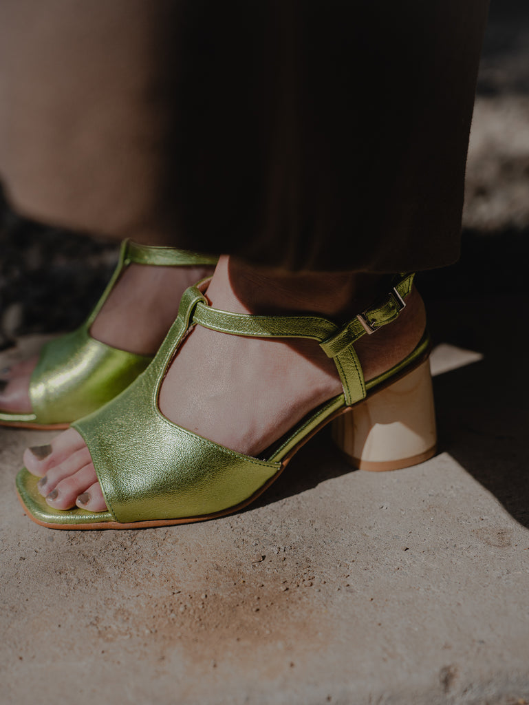 Sandalia de taco alto en madera natural. Fabricados en cuero folia verde lima y punta cuadrada. Regula el calce con la hebilla en color plata. Planta completa con acolchado light para más comodidad.